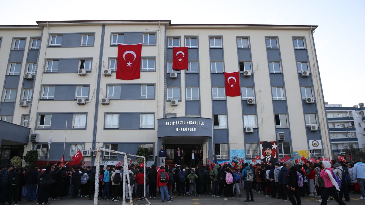 Necip Fazıl Kısakürek Ortaokulu'nda bir araya gelen ve Türk bayrakları taşıyan öğrenciler, İstiklal Marşı'nı okudu, şiirler seslendirdi.