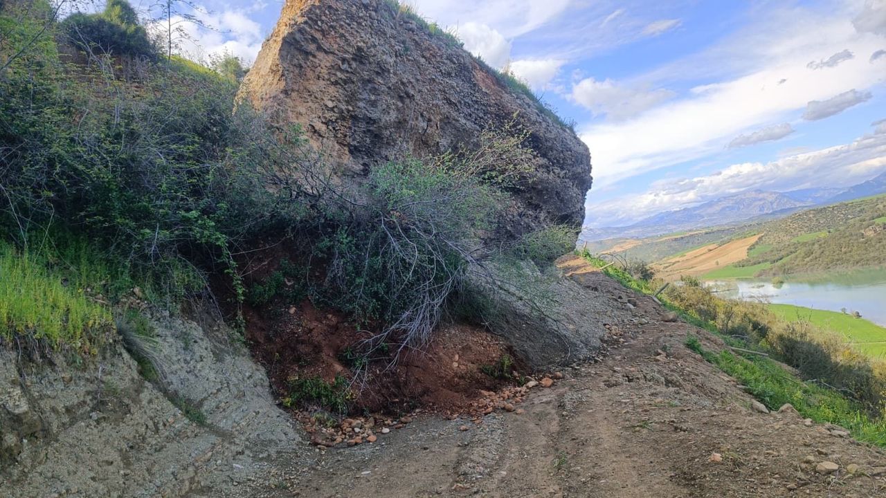 Topallı Mahallesi'nde yaklaşık 20 gün önce etkili olan sağanakta, yamaçtan kopan bir kaya yola yuvarlandı.
