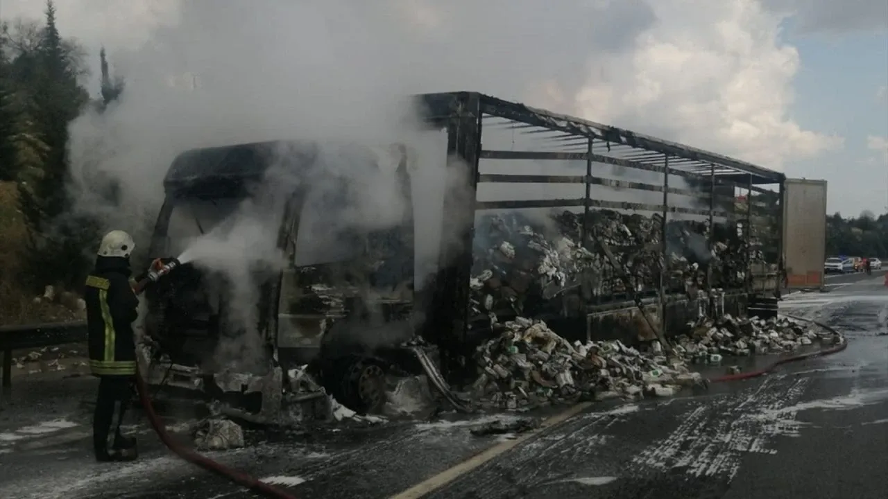 Ekiplerin müdahalesiyle söndürülen yangında tırda hasar oluştu.