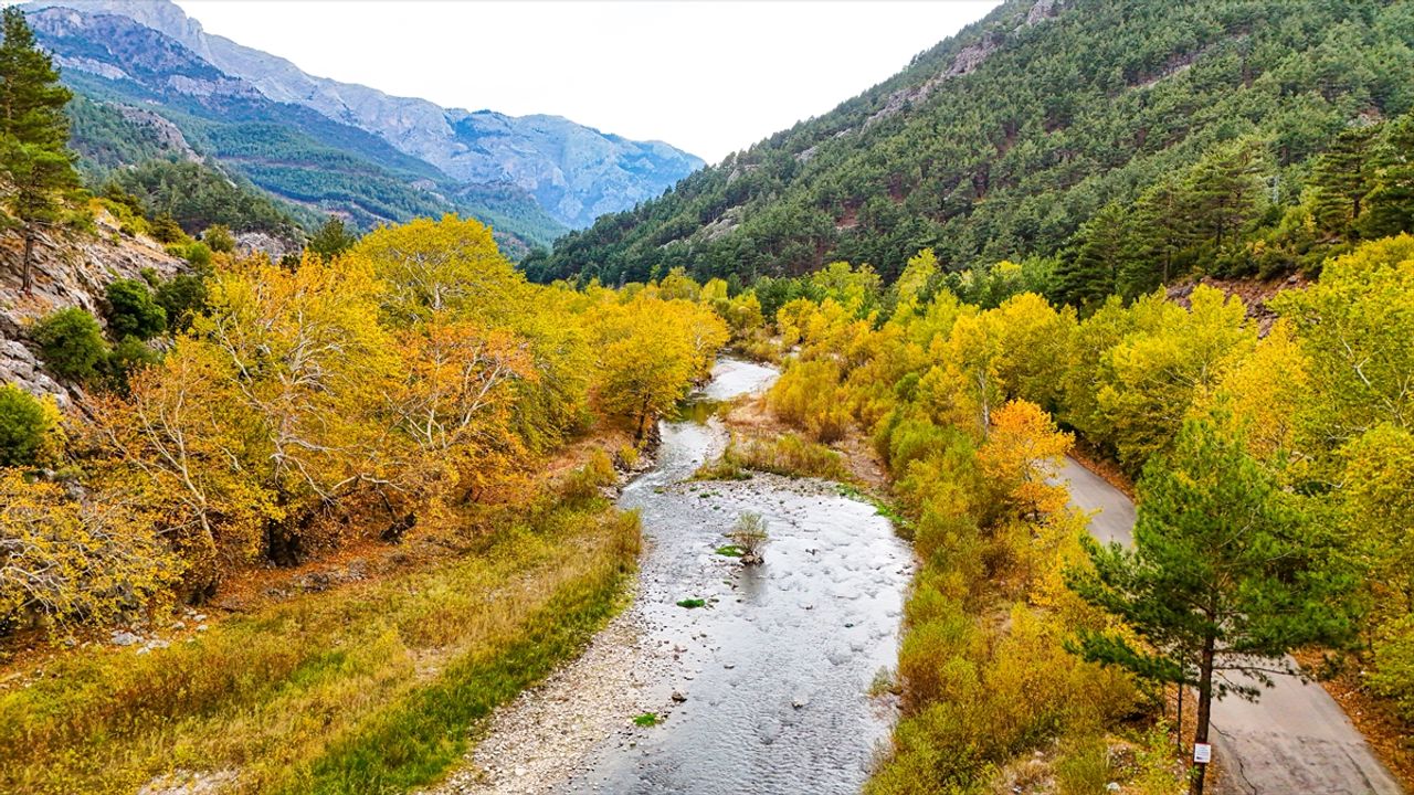 Kasım ayında sarı, kahverengi ve kızıl tonlarına bürünen ormanlar ile Çakıt Çayı dronla görüntülendi.