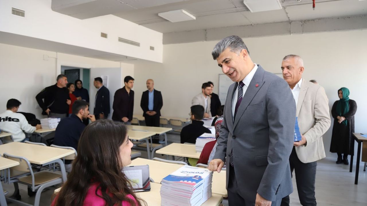 Merkezde üniversiteye hazırlanan öğrencilerle sohbet eden Şener, kaynak kitap seti dağıttı.