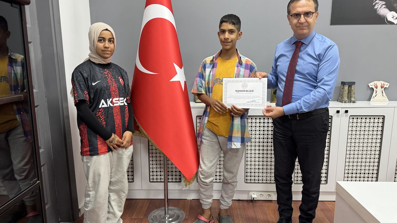Akseki İlçe Milli Eğitim Müdürlüğünde düzenlenen törende, İlçe Milli Eğitim Müdürü Nevzat Akbel, Şevki Yüksel ile öğrencisi Muhammet Şammat'a teşekkür belgesi verdi.