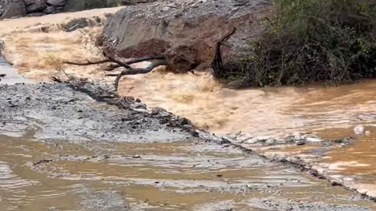 Taşkın nedeniyle mahalleleri bağlayan bir köprü üzerindeki asfalt zarar gördü, çamur ve taş parçaları yolu kapladı.