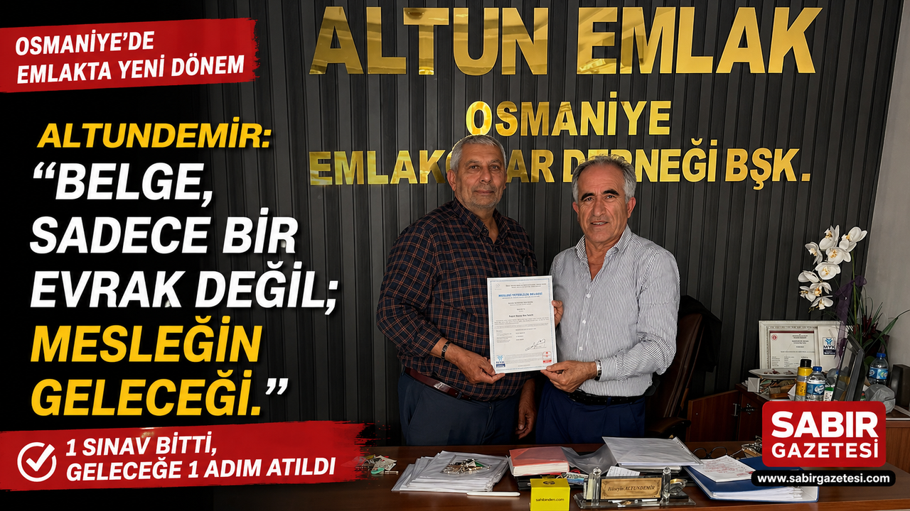 Osmaniye Emlakçılar Derneği tarafından organize edilen sınav, meslekte standartları yükseltmeyi hedefledi. Sınavı başarıyla tamamlayan isimlerden biri olan Aysungur’a belgesi, Dernek Başkanı Hüseyin Altundemir tarafından takdim edildi.