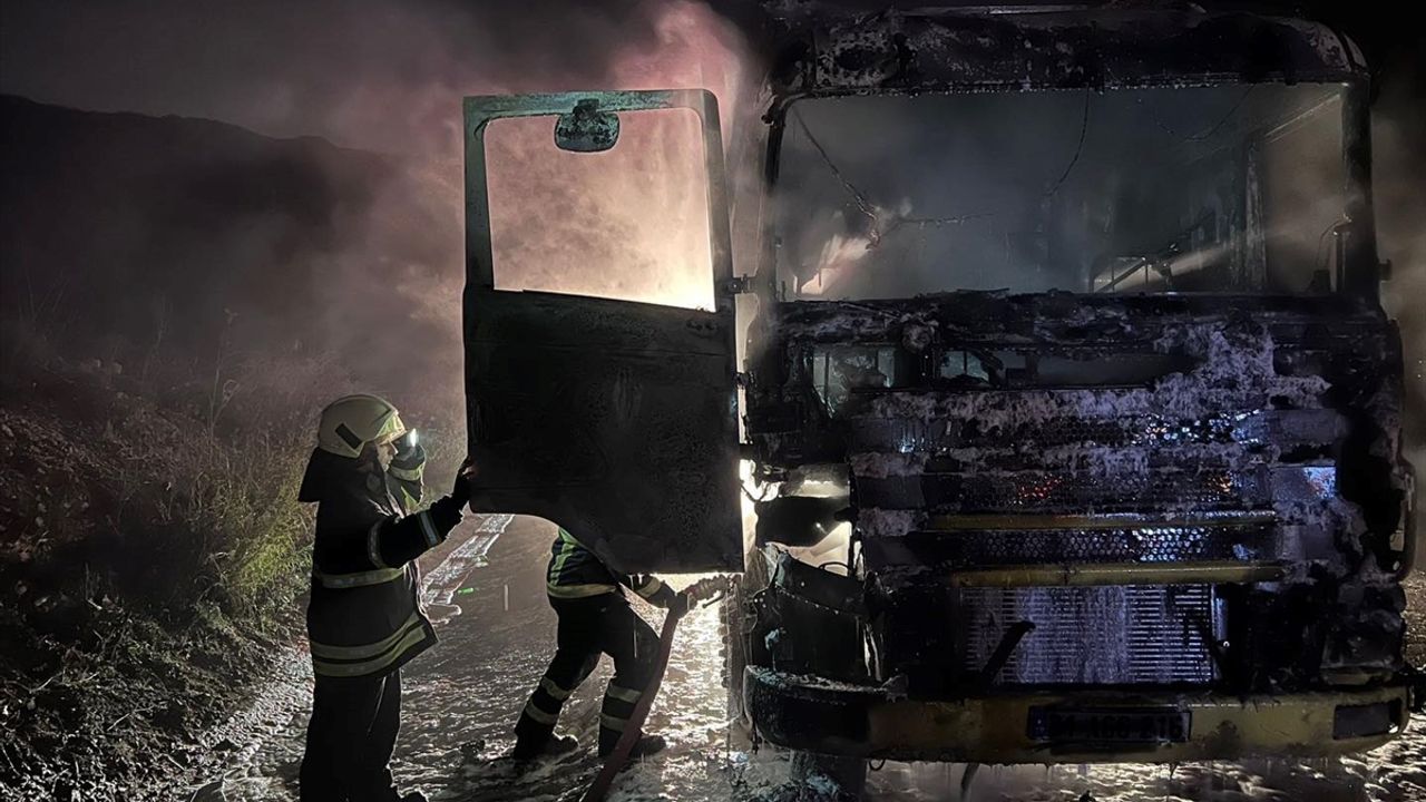 Ekiplerin müdahalesiyle söndürülen yangında tırda hasar oluştu.
