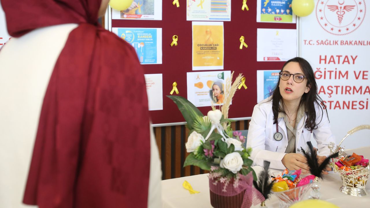 Hatay Eğitim ve Araştırma Hastanesi'nde gerçekleşen etkinlikte sağlık çalışanları tarafından hasta yakınlarına ve vatandaşlara çocukluk çağı kanserlerinde erken teşhisin önemi ve tedavi süreçleri anlatıldı.