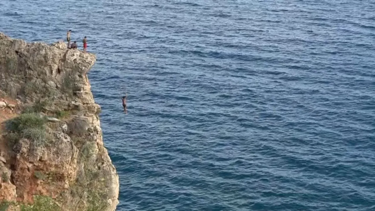 Turizm şehri Antalya’da, artan hava sıcaklıklarıyla birlikte dünyaca ünlü Konyaaltı Sahili vatandaşların ve tatilcilerin akınına uğruyor. Günün her saati dolu olan sahil, adrenalin seven gençlerin de uğrak noktası oluyor. Bazı gençler falezlerin altındaki küçük kaya üzerinden denize atlarken, bazıları ise macera uğruna falezlerin uç noktasına geldi. Bir süre falezlerin uç noktasında konuşan ve birbirlerine cesaret veren gençlerden ikisi kendini ayaklarının üzerinde denize bıraktı. Tehlikeli ve sert bir şekilde suya düşen gençler, daha sonra yüzerek kıyıya çıktı. İki genç atlamak için gelse de arkadaşlarının tavsiyesiyle vazgeçti.