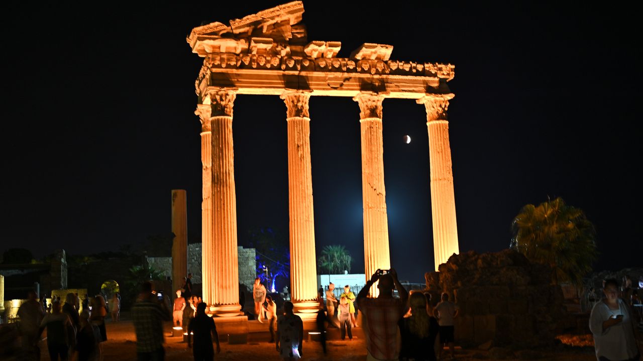 Akşam saatlerinde başlayan tutulma sırasında, Side Antik Kenti Apollon Tapınağı yanında yoğunluk yaşandı.