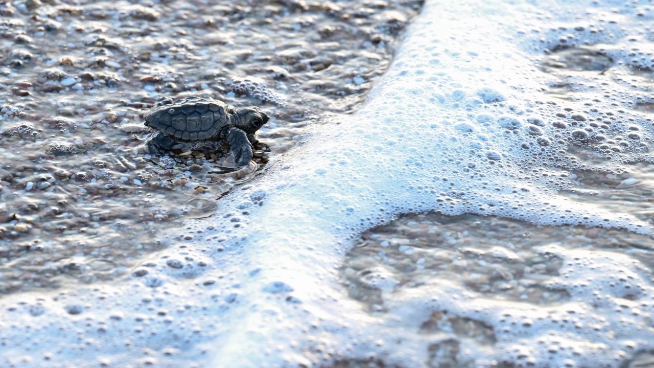 Ekiplerin, mayıs ayından bu yana koruduğu yuvalardan çıkan yavrular zorlu yolculuğun ardından mavi sularla buluşuyor.