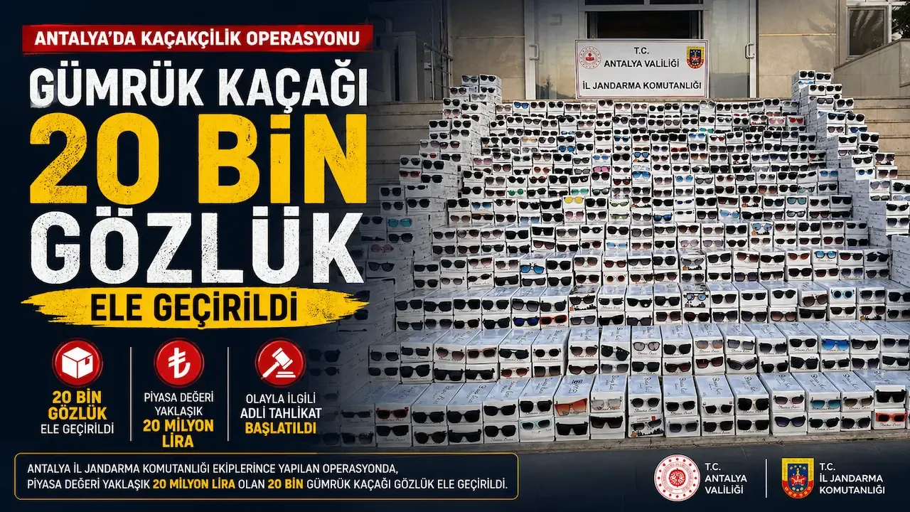 Antalya’nın Alanya ilçesinde düzenlenen operasyonda 20 bin gümrük kaçağı gözlük ele geçirildi. Piyasa değeri yaklaşık 20 milyon lirayı bulan ürünler, kaçakçılıkla mücadelede dikkat çeken bir adımı ortaya koydu.