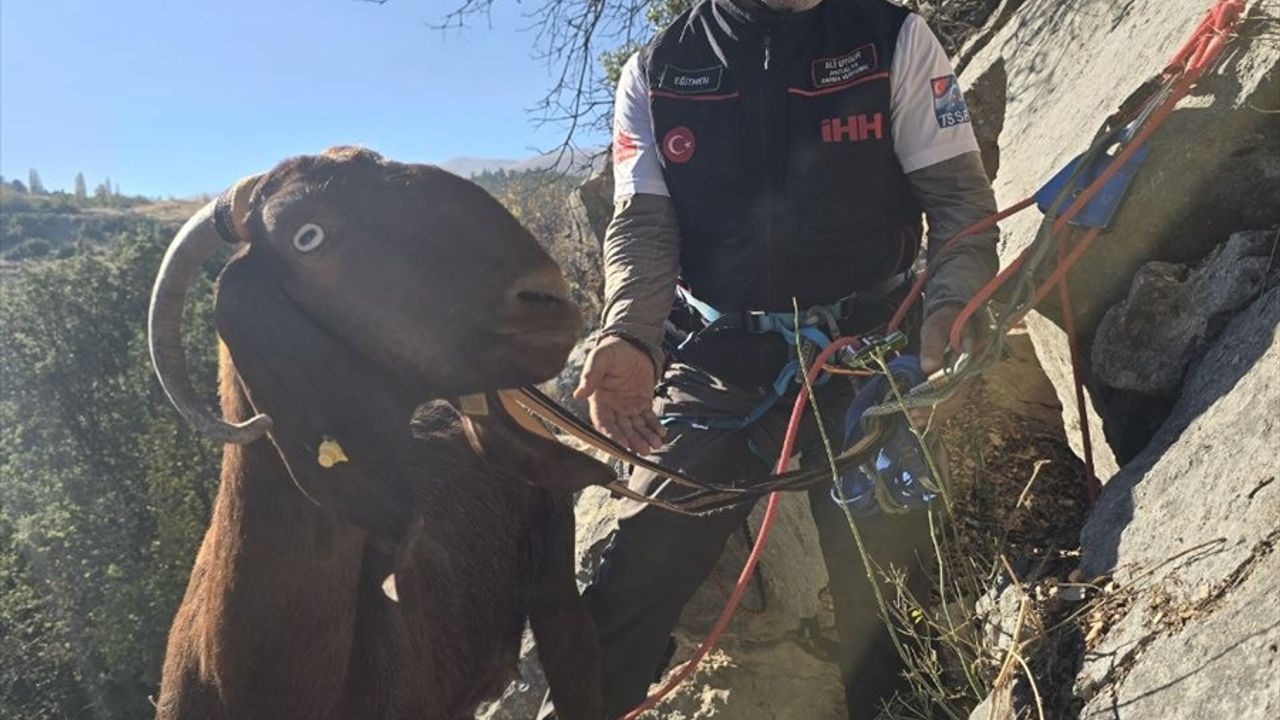Ekipler, keçilerin bulunduğu bölgeye halatla ulaşarak kayalıklardaki 3 keçiyi kurtarma çalışması yürüttü.