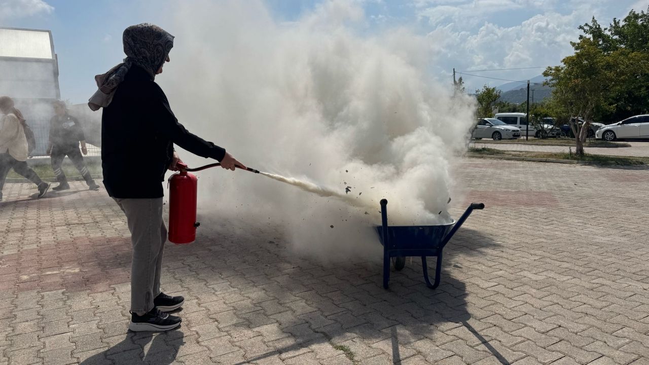Tatbikat öncesi, görevli personel ve öğrencilere Antalya Büyükşehir Belediyesi Kumluca İtfaiye Birimi tarafından eğitim verildi.
