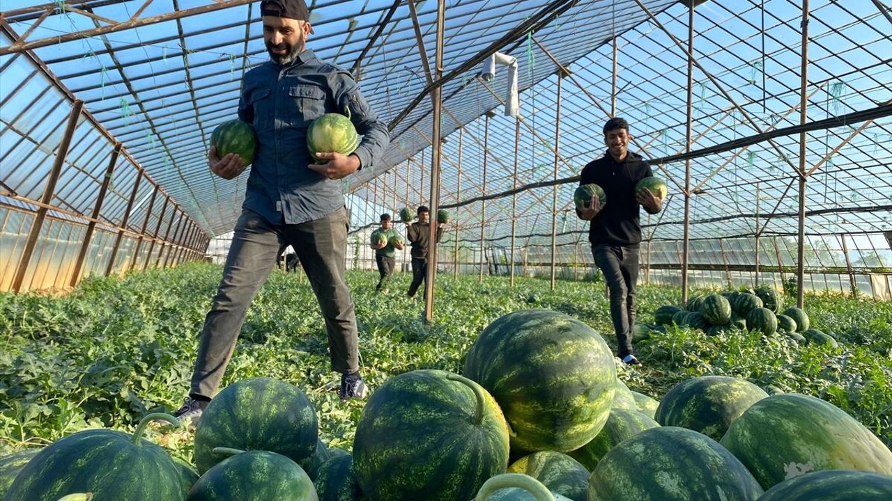 Aksu ilçesinde örtü altında üretilen erkenci karpuzlar, yaklaşık 4 aylık sürecin ardından hasat edildi.