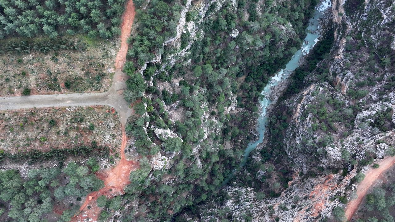 Bölgede oluşan manzara, kanyonda suyun akışı ve şelalenin çağlaması, AA ekibi tarafından dronla görüntülendi.