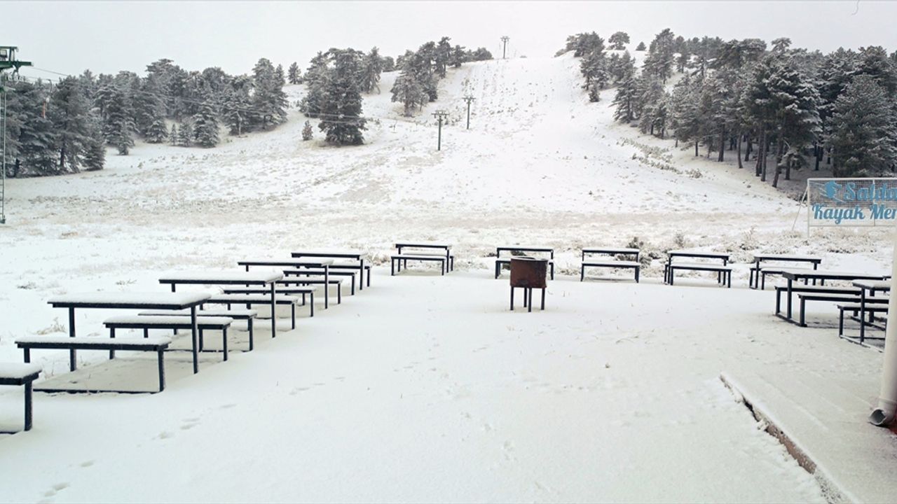 BURDUR (AA) - Burdur'un Yeşilova ilçesinde yeşil, beyaz ve mavinin iç içe olduğu Salda Gölü manzaralı Salda Kayak Merkezi'nde ilk kar yağdı.