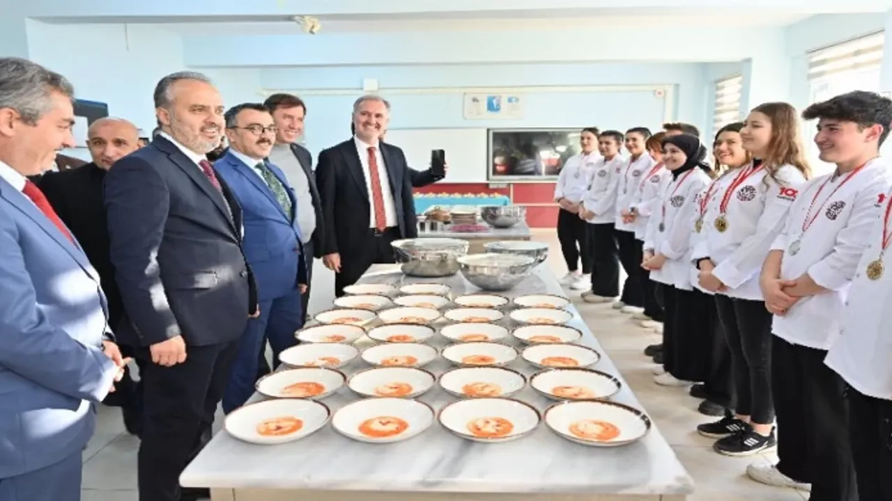 Bursa Büyükşehir Belediye Başkanı Alinur Aktaş, ‘20. Uluslararası Mutfak Günleri’nde 6 altın, 8 gümüş ve 1 bronz madalya kazanarak ‘En İyi Lise’ unvanını alan Hacı Sevim Yıldız 4 Mesleki ve Teknik Anadolu Lisesi’ni ziyaret ederek öğrencileri tebrik etti.