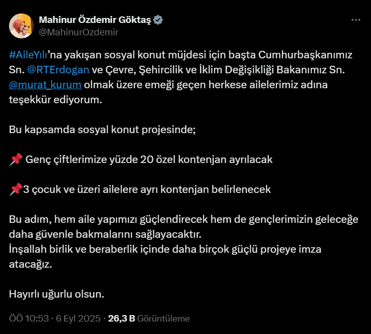Bakan Göktaş, sosyal medya hesabı X üzerinden yaptığı paylaşımda, proje kapsamında genç çiftlere yüzde 20 özel kontenjan ayrılacağını duyurdu.