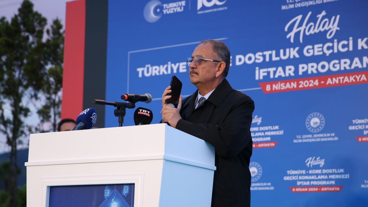 Merkez Antakya ilçesindeki Türkiye Kore Dostluk Geçici Konaklama Merkezi'nde düzenlenen iftar programında, Çevre, Şehircilik ve İklim Değişikliği Bakanı Mehmet Özhaseki'nin telefonla aradığı Cumhurbaşkanı Erdoğan, vatandaşlara seslendi.