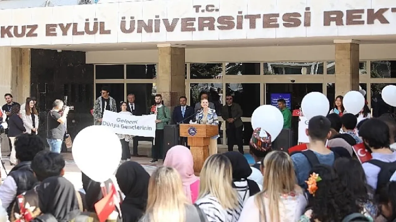 Türkiye’nin köklü yükseköğretim kurumlarından birisi olan Dokuz Eylül Üniversitesi’nde yabancı uyruklu yaklaşık 200 öğrenci, DEÜ Rektörlüğü önünde bir araya geldikleri Rektör Prof. Dr. Nükhet Hotar ile barışı simgeleyen beyaz balonları gökyüzüne uçurdular. Üniversitelerin yalnızca bilgi üreten mekanlar değil; aynı zamanda hoşgörü tohumlarının ekildiği, barış filizlerinin yeşerdiği yerler olduğunu vurgulayan Rektör Hotar, “Dünya gençliğinin adeta bir buluşması görünümünde olan bugünkü etkinliğimizde, İsrail’in Filistin topraklarındaki saldırılarını bir kez daha net bir biçimde kınayarak; insan haklarının önemini vurguladık” dedi.