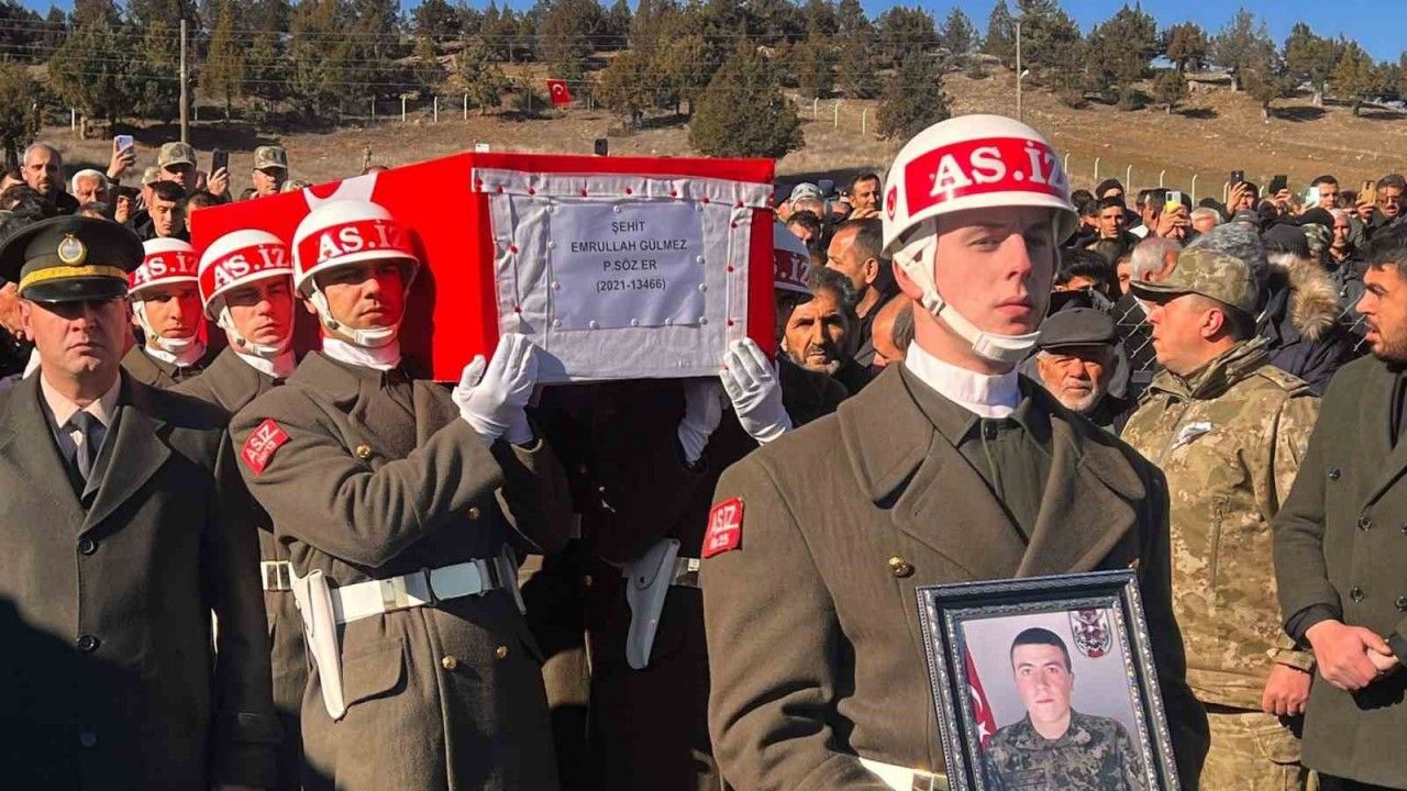 Pençe-Kilit Harekatı bölgesindeki üs noktasına sızmaya çalışan teröristlerle çıkan çatışmada doğum gününe 5 gün kala şehit düşen Piyade Sözleşmeli Er Emrullah Gülmez (23), memleketi Kahramanmaraş’ın Göksun ilçesinde son yolculuğuna uğurlandı.