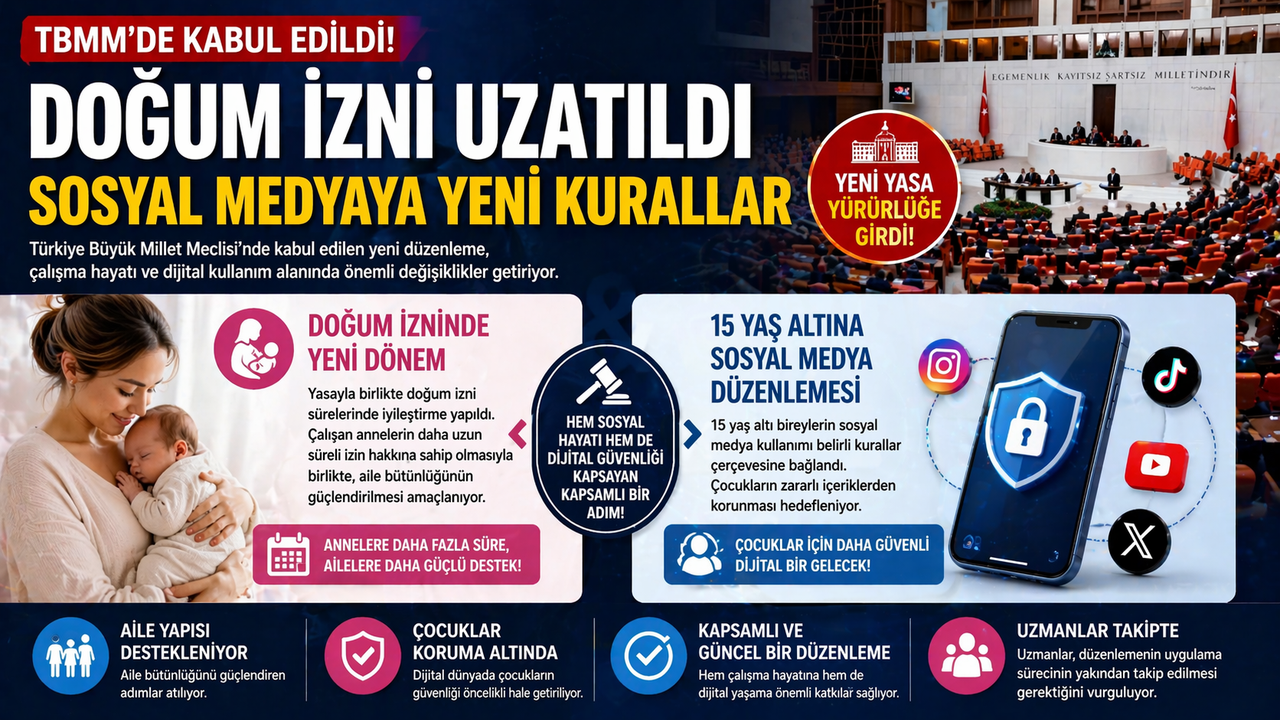 Türkiye Büyük Millet Meclisi’nde kabul edilen yeni düzenleme, çalışma hayatı ve dijital kullanım alanında önemli değişiklikler getiriyor. Doğum izni süresinin uzatılması ve 15 yaş altı çocukların sosyal medya kullanımına yönelik sınırlamaları içeren kanun teklifi yasalaştı.