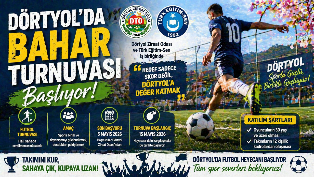 Hatay’ın Dörtyol ilçesinde sporseverleri bir araya getirecek Bahar Futbol Turnuvası için geri sayım başladı. Dörtyol Ziraat Odası ile Türk Eğitim-Sen iş birliğinde düzenlenen organizasyon, kentin sosyal hayatına hareket katmayı hedefliyor.
