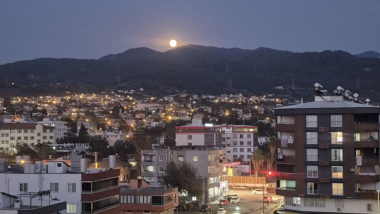 Amanos Dağları'nın heybetli silüeti üzerinde yakalanan hem kızıl gün batımı/doğumu renkleri hem de dağların arkasından yükselen dolunay manzaraları, izleyenlerden tam not aldı.
