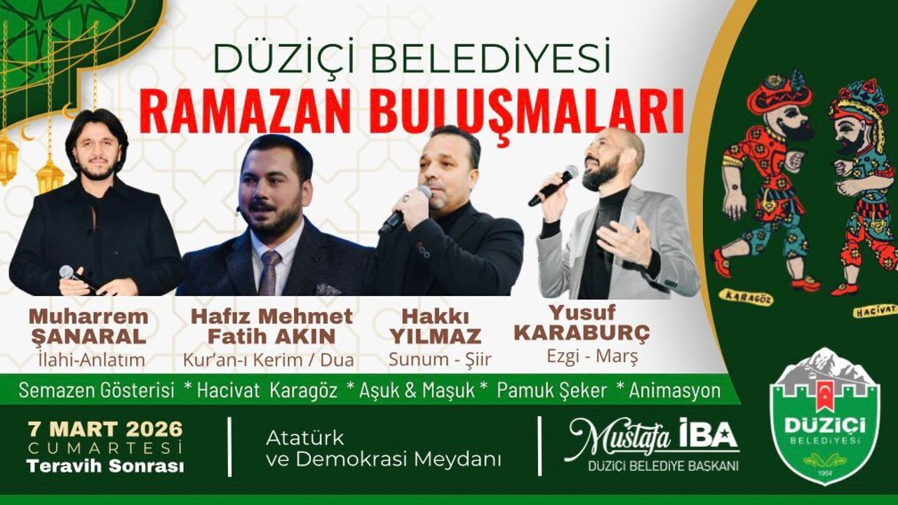 Düziçi Belediyesi, Ramazan ayı dolayısıyla düzenlediği Ramazan Buluşmaları programını 7 Mart 2026 Cumartesi günü gerçekleştirecek. Teravih namazının ardından Atatürk ve Demokrasi Meydanı’nda başlayacak etkinlikler, tüm vatandaşlara keyifli bir akşam yaşatmayı hedefliyor.