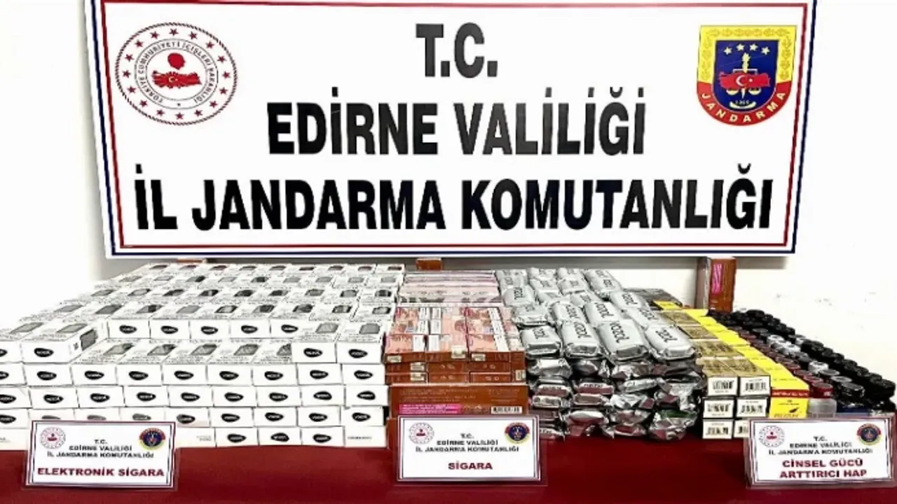 Erdoğan DEMİR / EDİRNE (İGFA) - Edirne İl Jandarma Komutanlığı ekiplerince yapılan çalışmalar neticesinde, Uzunköprü ilçesi İpsala Sınır Kapısı güzergahında bir araçta yapılan aramada; 350 adet elektronik sigara, 900 adet kaçak sigara, 334 adet cinsel güç artırıcı hap ele geçirildi.