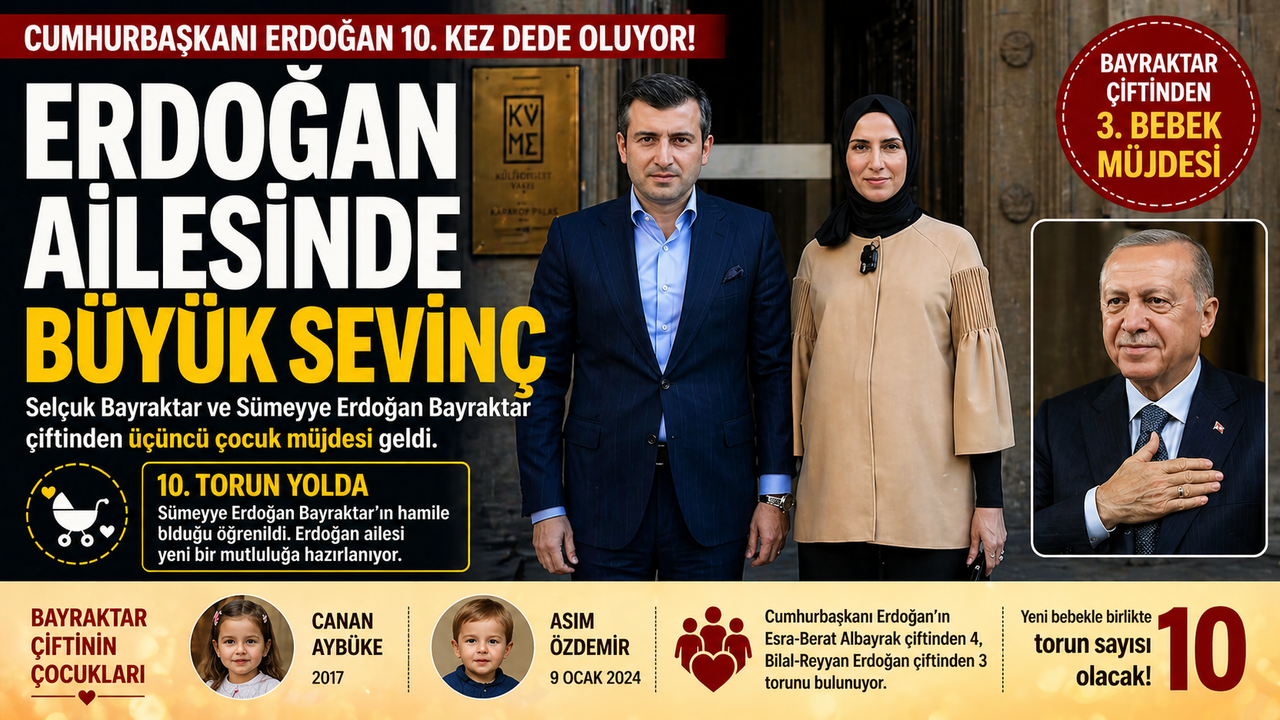 Cumhurbaşkanı Recep Tayyip Erdoğan, aile mutluluğunu bir kez daha yaşamaya hazırlanıyor. Baykar Holding Yönetim Kurulu Başkanı Selçuk Bayraktar ile Sümeyye Erdoğan Bayraktar çiftinin üçüncü çocuklarını beklediği öğrenildi. Bu gelişmeyle birlikte Erdoğan’ın torun sayısı 10’a yükseliyor.
