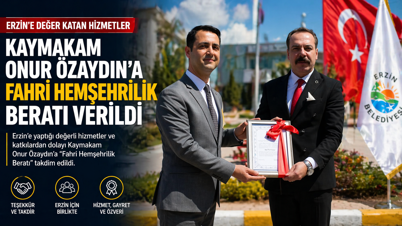 Erzin Belediye Meclisi’nin tüm siyasi partilerin oy birliğiyle aldığı karar doğrultusunda, Erzin Kaymakamı Onur Özaydın’a “Fahri Hemşehrilik Beratı” takdim edildi.