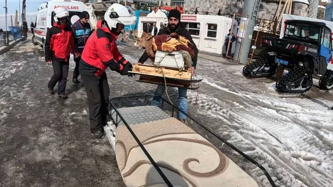 Ekipler, vatandaşı ve buzağısını kar motorlarının arkasına bağladığı kızaklı sedye ile yerleşim yerine güvenli şekilde ulaştırdı.