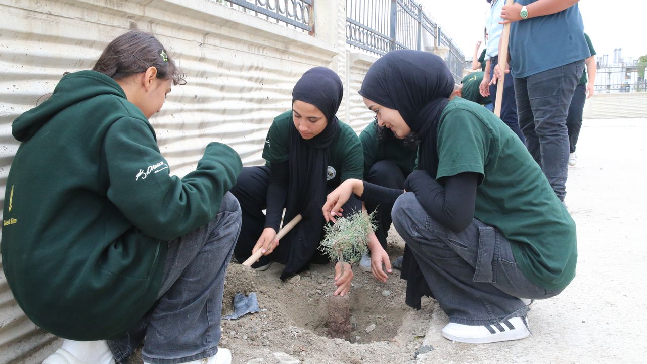 Öğretmenlerinin öncülüğünde çam, defne, limon ve mandalina fidanlarını toprakla buluşturan öğrenciler, eğitimlerini yerinde deneyimleme şansı buluyor.