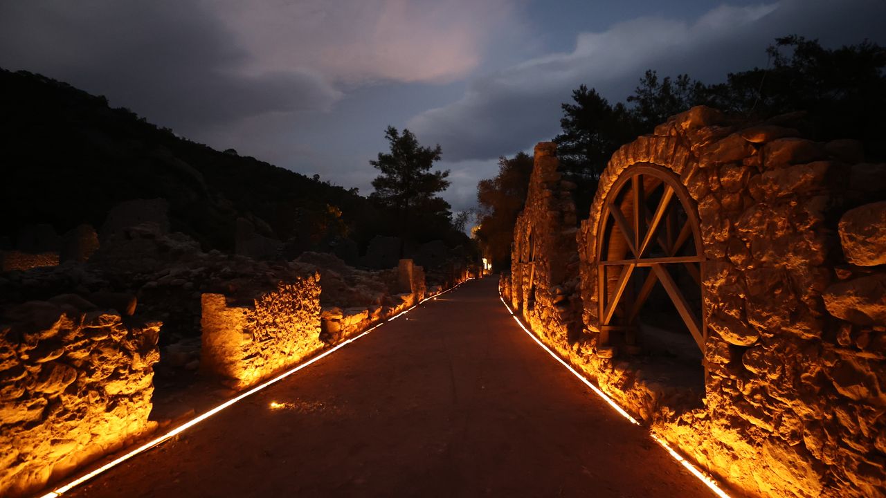 Gece müzeciliğinin uygulandığı kentlerden olan Olympos'ta da ışıklandırma çalışmalarıyla akşam saatlerinde de ziyaretçi ağırlanmaya başlandı.