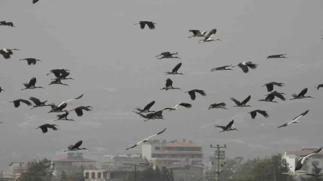 Leylekler Hatay’ın Samandağ ilçesi semalarında görsel şölen oluşturdu. Hava akımını yakalayıp ahenkle süzülen leylekler kameraya saniye saniye yansıdı.