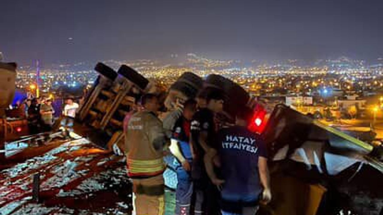 Yılmaz Kanal idaresindeki 06 FU 7742 hafriyat kamyonu, Antakya-Altınözü kara yolunun Narlıca mevkisinde devrildi.
