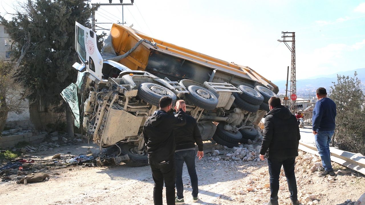 Sürücüsünün ismi öğrenilemeyen 06 DLE 405 plakalı hafriyat kamyonu, Antakya-Altınözü kara yolunun Narlıca mevkisinde devrildi.