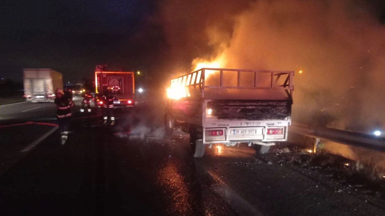 Payas-Dörtyol Otoyolu'nda seyir halindeki plastik malzemeler yüklü V.D. yönetimindeki pikapta, henüz belirlenemeyen nedenle yangın çıktı.