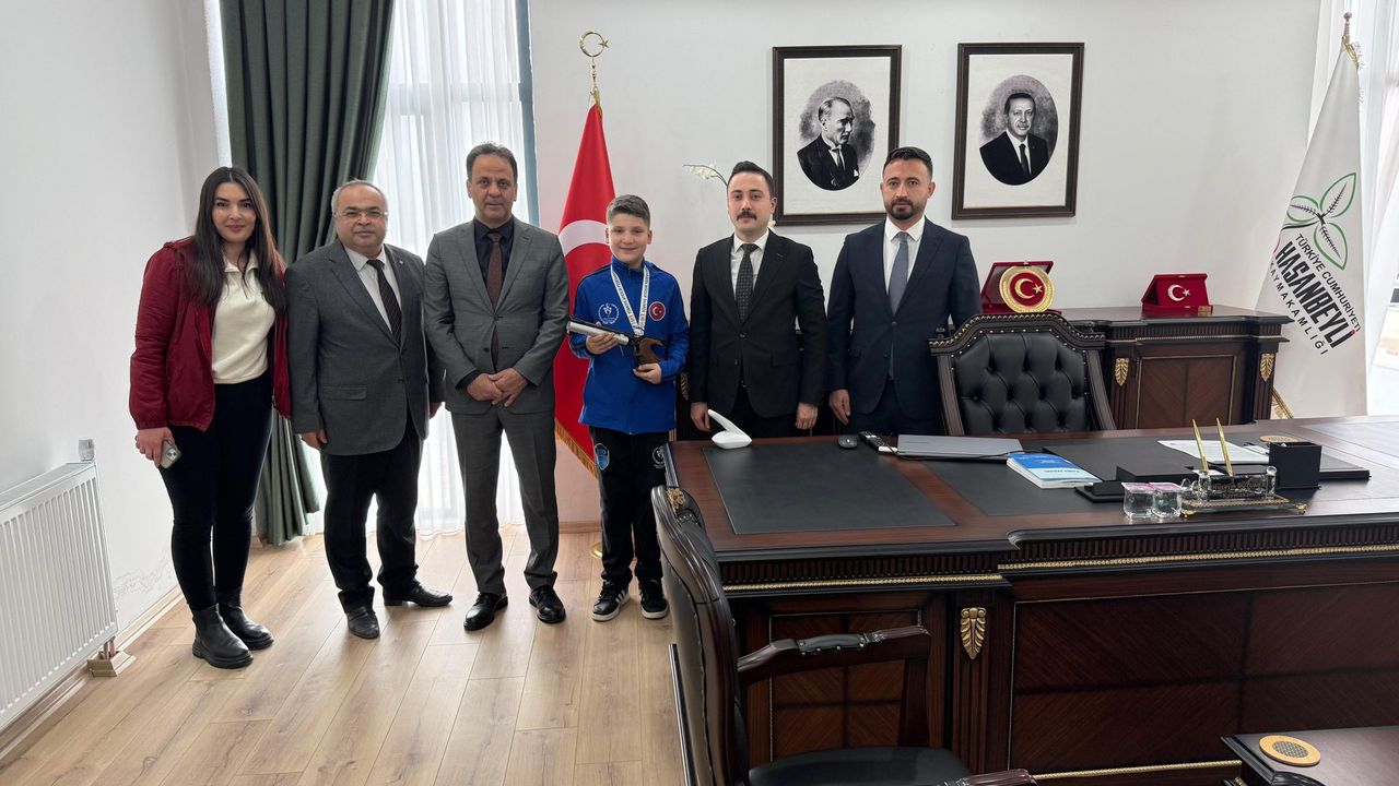 Hasanbeyli Kaymakamı Sayın Hüseyin Bütüner, Mersin’de düzenlenen Havalı Silahlar 1. Grup Tabanca Müsabakaları’nda önemli bir başarıya imza atan öğrenciyi makamında kabul etti. 30 Ocak – 1 Şubat 2026 tarihleri arasında gerçekleştirilen organizasyonda U-12 Erkekler kategorisinde bölge üçüncüsü olan Gazi Mustafa Kemal Ortaokulu öğrencisi Yusuf Özay, Hasanbeyli’nin gururu oldu.