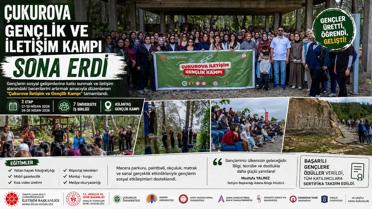 Çukurova İletişim ve Gençlik Kampı, 2 etaplık yoğun programın ardından tamamlandı. Farklı şehirlerden gelen öğrenciler, hem iletişim becerilerini geliştirdi hem de sosyal etkinliklerle güçlü bir kamp deneyimi yaşadı.
