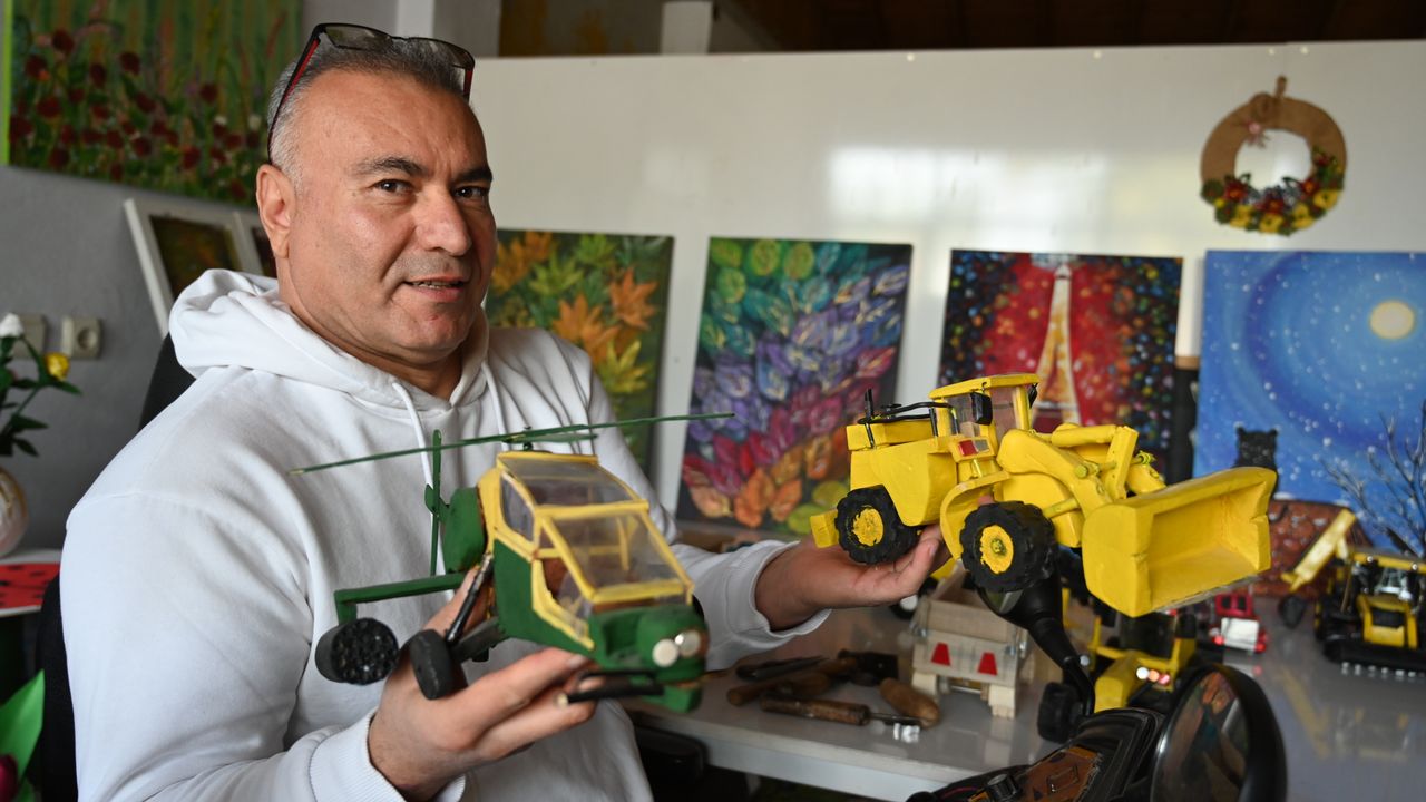 İkametinin bir köşesini atölyeye çeviren Yiğit, ağaç kabuğu ve tahta parçalarından traktör, biçerdöver, kepçe, kamyon ve helikopter şeklinde oyuncaklar tasarlıyor.