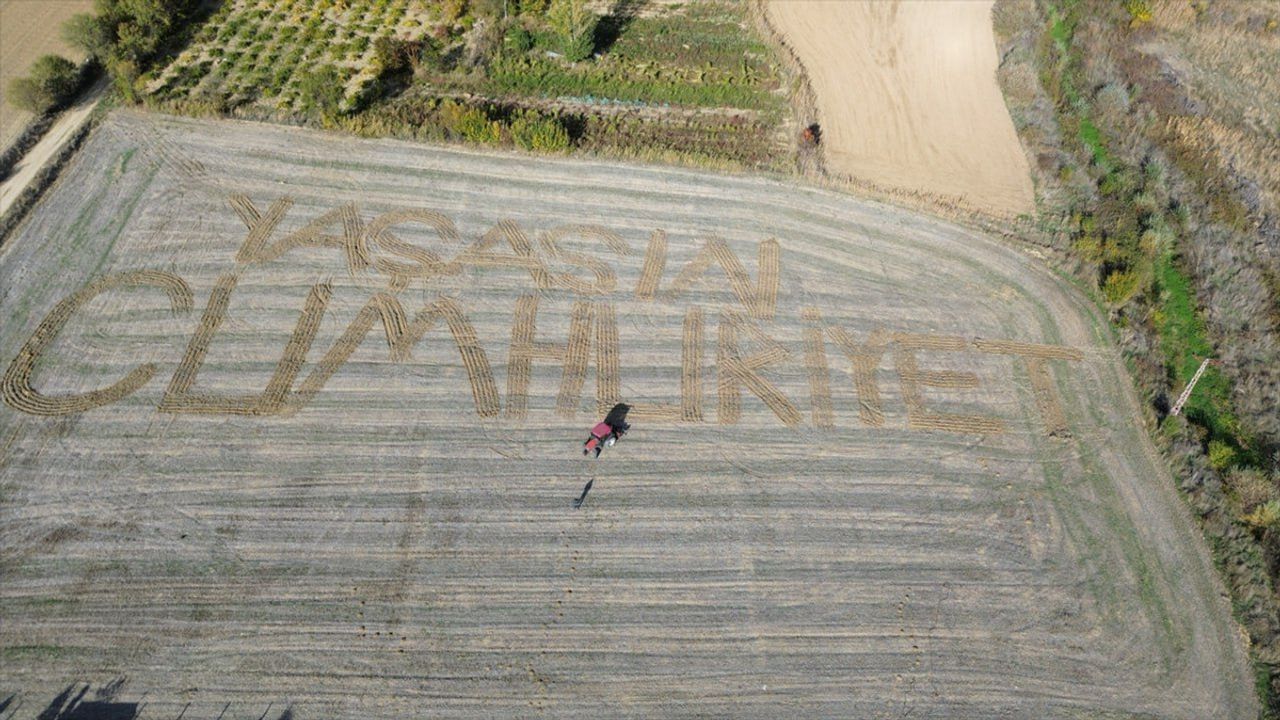 Bağkonak köyünde çiftçilik yapan 28 yaşındaki Fahri Gürsal, 29 Ekim Cumhuriyet Bayramı dolayısıyla traktörünün pulluğuyla tarlasına 3 saatte 'Yaşasın Cumhuriyet' yazdı.