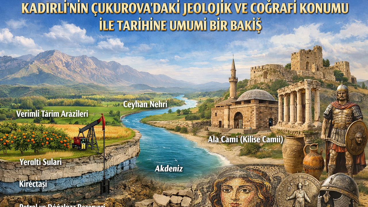 Çukurova; deniz üstüne gölün, gölün üstüne nehirlerin meydana geldiği bir alüvyon düzlük olup, denizin dolmasıyla genişlemiş ve genişlemeye de halen devam etmekte olan mümbit bir ovadır. Kadirli de bu ovanın kuzeydoğusunda, Toros Dağları'nın eteğine yerleşmiş güzel bir yerleşim birimidir. Kadirli'nin doğusunda Keşiş (Mahalli ağızla Keğiş) Irmağı, batısında Sumbas Irmağı, kuzeyinde Mazgaç Beli ve Toklu Dağı, güneyinde ise Ceyhan Nehri bulunmaktadır.