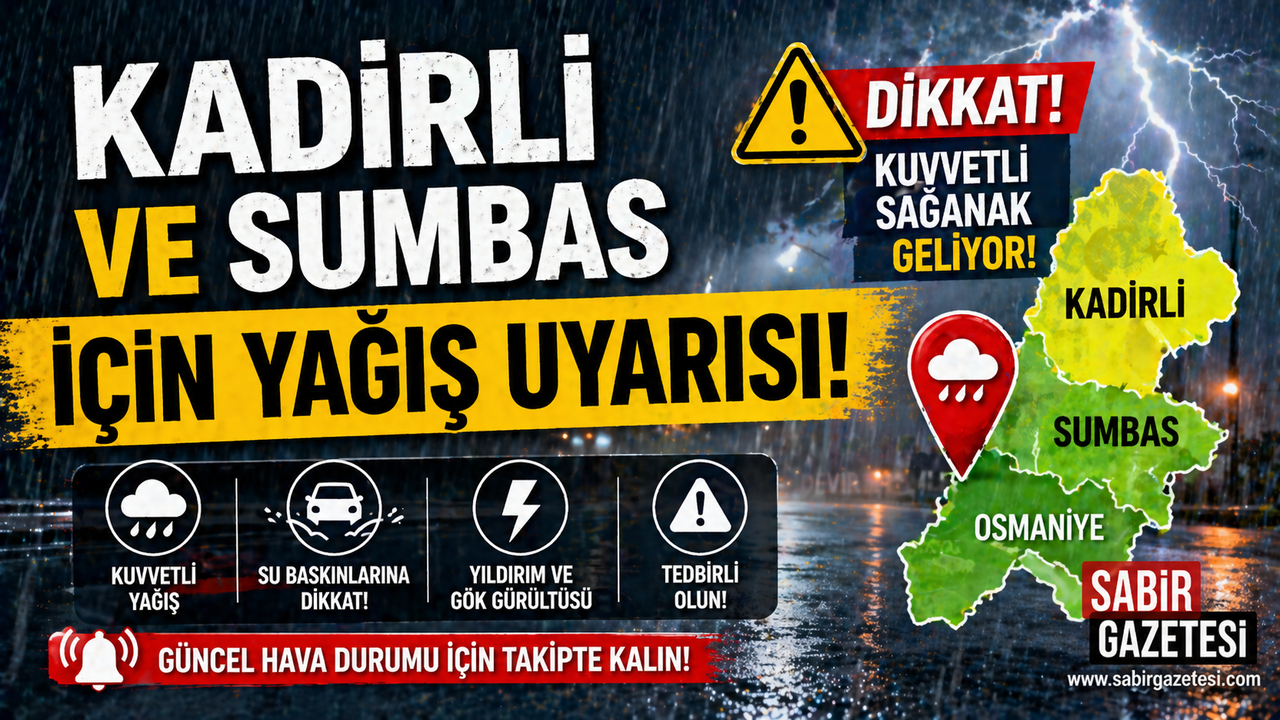 Osmaniye Valiliği, kuvvetli yağış uyarısında bulundu. Kadirli ve Sumbas ilçelerinde kısa süreli ancak etkili sağanak bekleniyor.