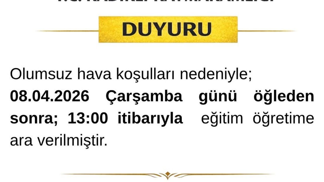 Kadirli Kaymakamı Erdinç Dolu imzasıyla yayımlanan resmi açıklamaya göre, hava koşullarının beraberinde getirebileceği olumsuzluklara karşı önlem amaçlı olarak 8 Nisan Çarşamba günü (bugün) saat 13:00'ten itibaren okullar tatil edildi.