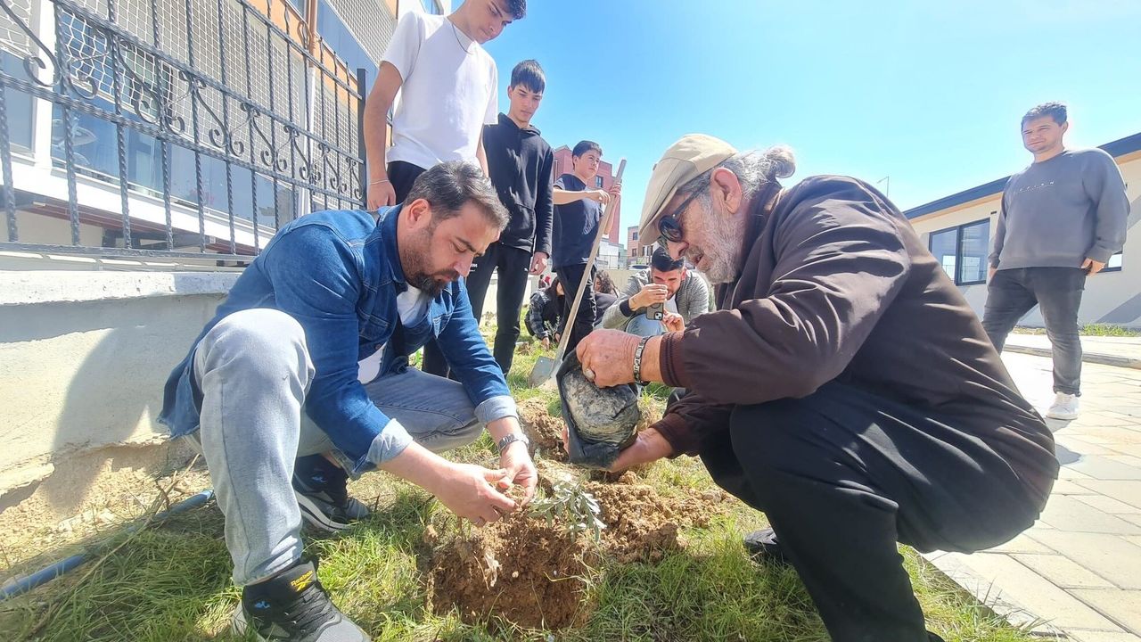 Öğrenciler, huzurevi sakinleriyle hizmet binası bahçesinde zeytin, limon ve elma fidanlarını toprakla buluşturdu.