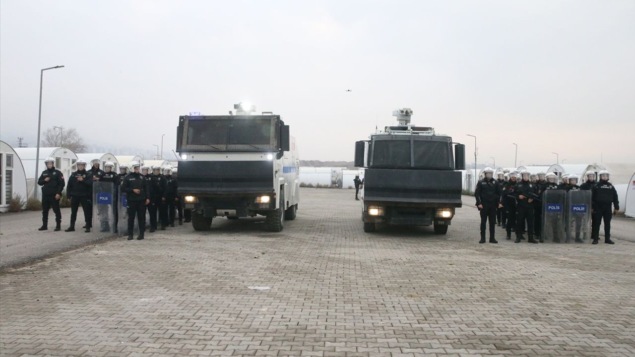 İl Emniyet Müdürlüğünce Sakarya Konteyner Kent Yerleşkesi'nde yapılan tatbikatta, senaryo gereği küçülmeye giden bir konteyner üretim fabrikasından bazı işçilerin çıkarılması üzerine izinsiz gösteri yapan ve yolu kapatan gruba müdahale edildi.