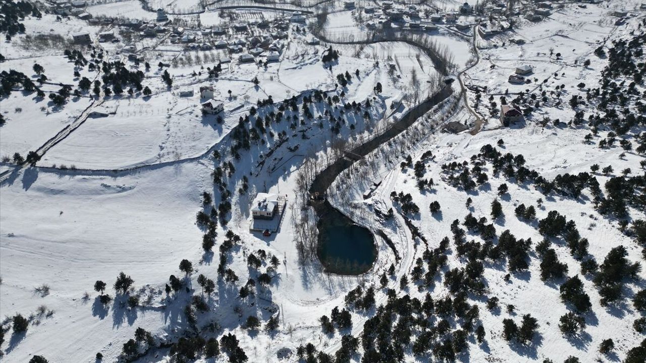 Berrak suyu ve turkuaz rengiyle bilinen Yeşilgöz Gölü, kar yağışı sonrası güzel görüntü oluşturdu.