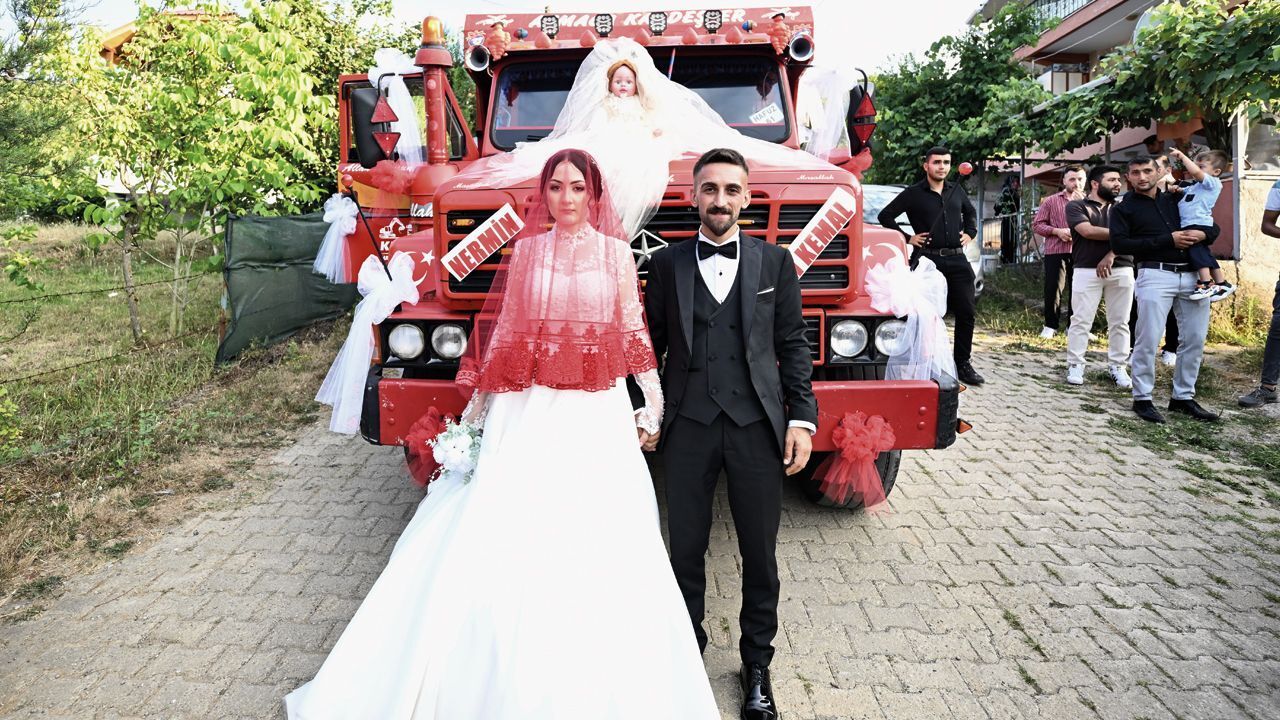Düzce’nin Kaynaşlı ilçesi, sıra dışı ve renkli bir düğüne sahne oldu. 26 yaşındaki kamyon şoförü Ali Kemal Kazancı, hafriyat işlerinde kullandığı kamyonunu süsleyerek gelin arabası yaptı. Genç damat, 23 yaşındaki gelin adayı Nermin Kazancı’yı kamyonla baba evinden alarak şehir turuna çıktı.