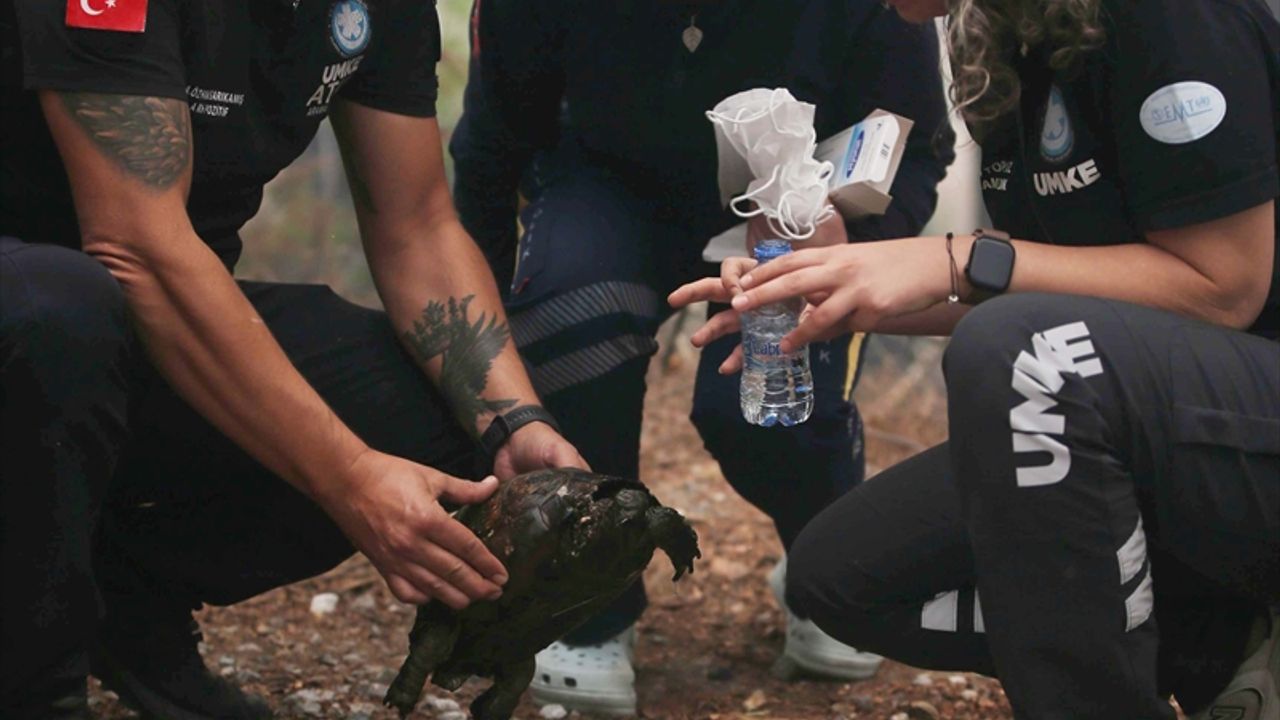 Orman yangınında UMKE ekiplerce kurtarılan kaplumbağa, bölgede güvenli alana getirildi.